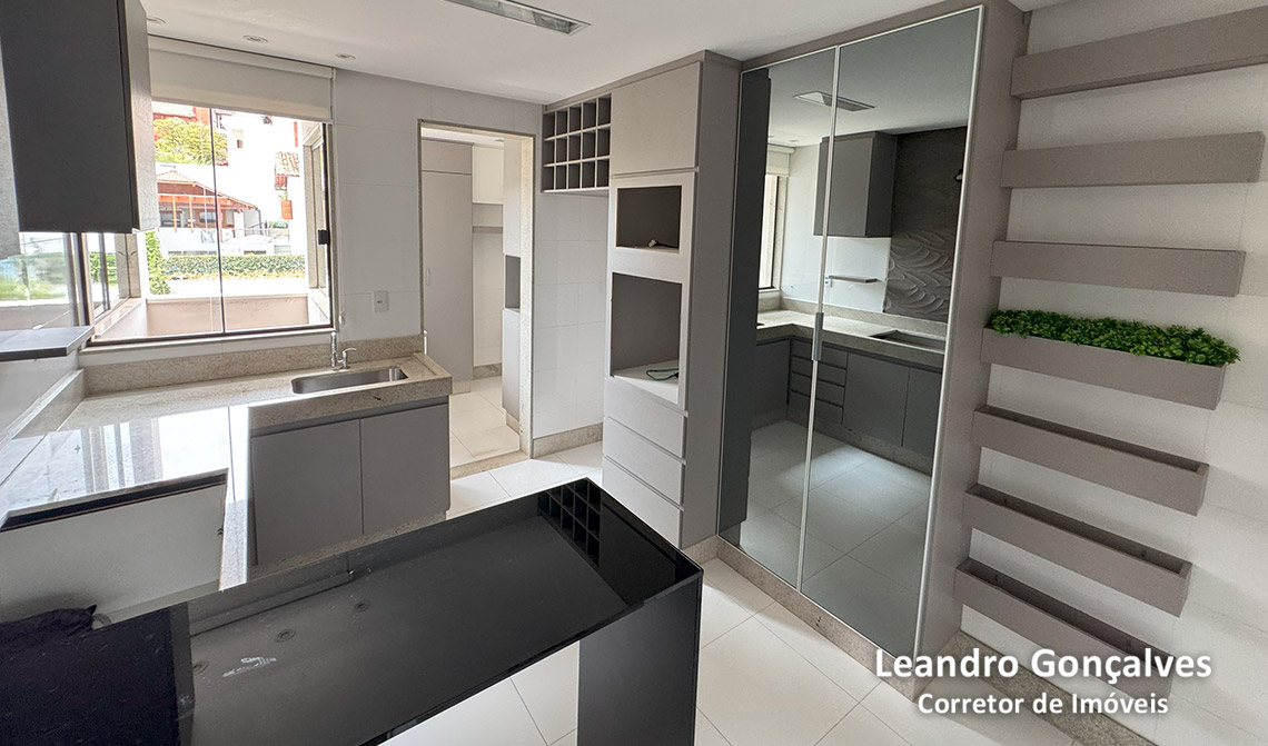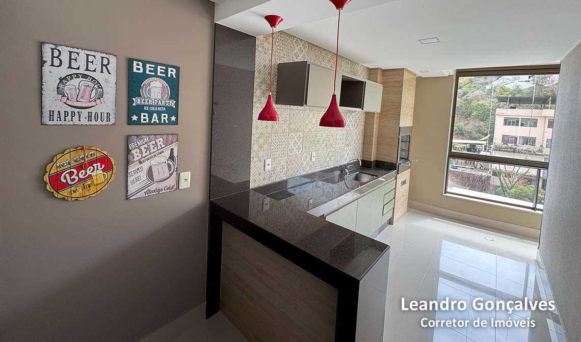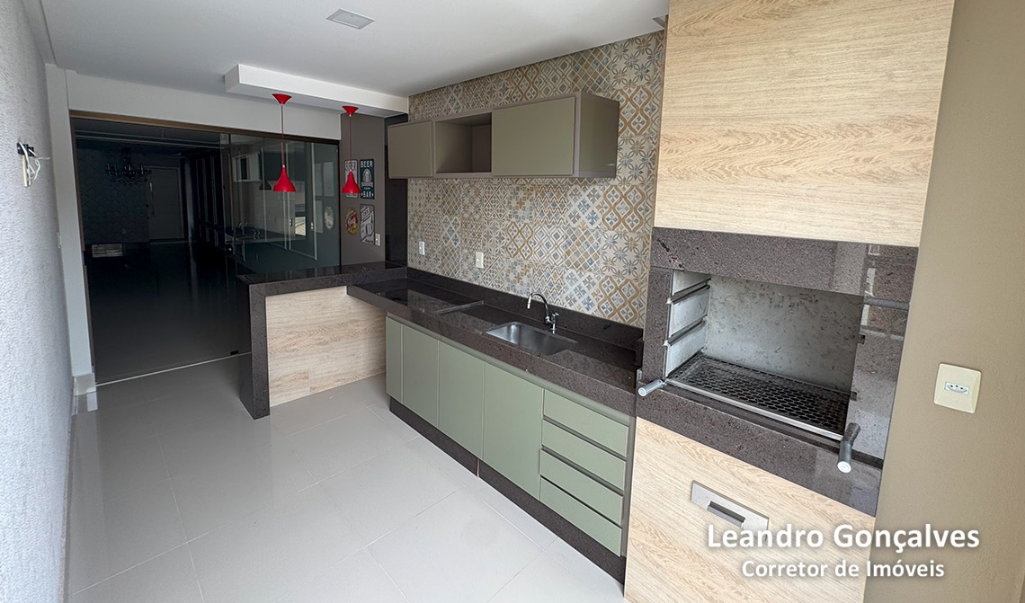 Área gourmet: possui armários, pendentes, ponto de TV, papel de parede e varanda já fechada com cortina de vidro.