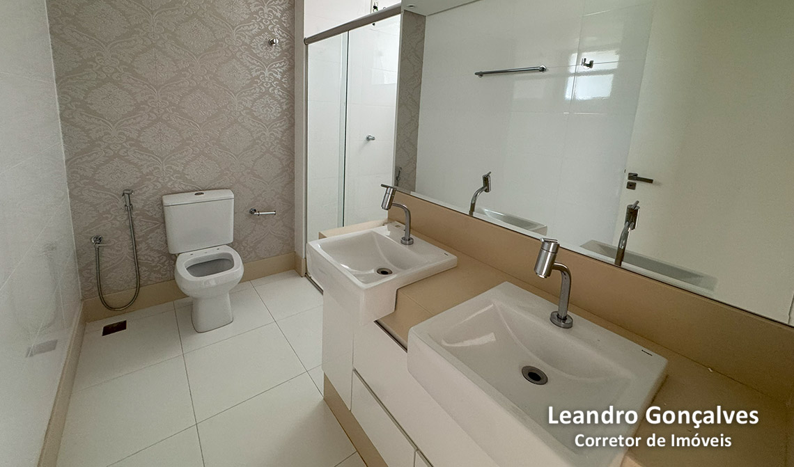 Banheiro da suíte master: acabamento diferenciado, com duas pias, dois chuveiros e armários planejados.