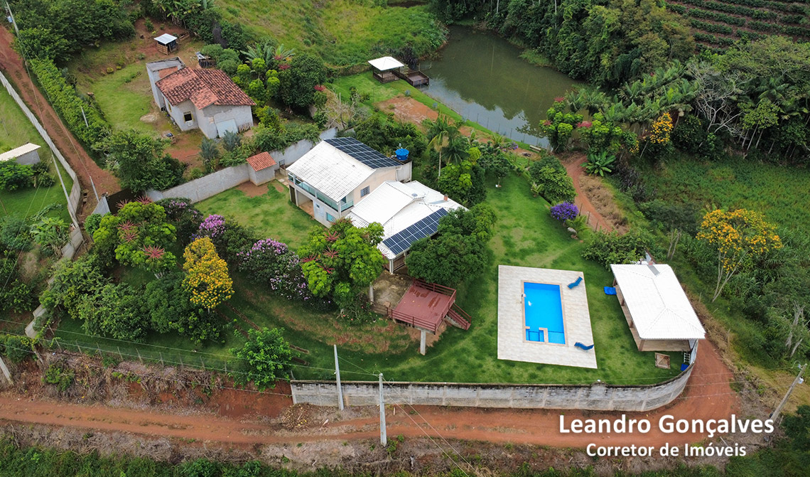 Piscina, área gourmet com churrasqueira, forno de barro, espaço aberto com varandão com área verde e amplo pomar com frutas variadas.